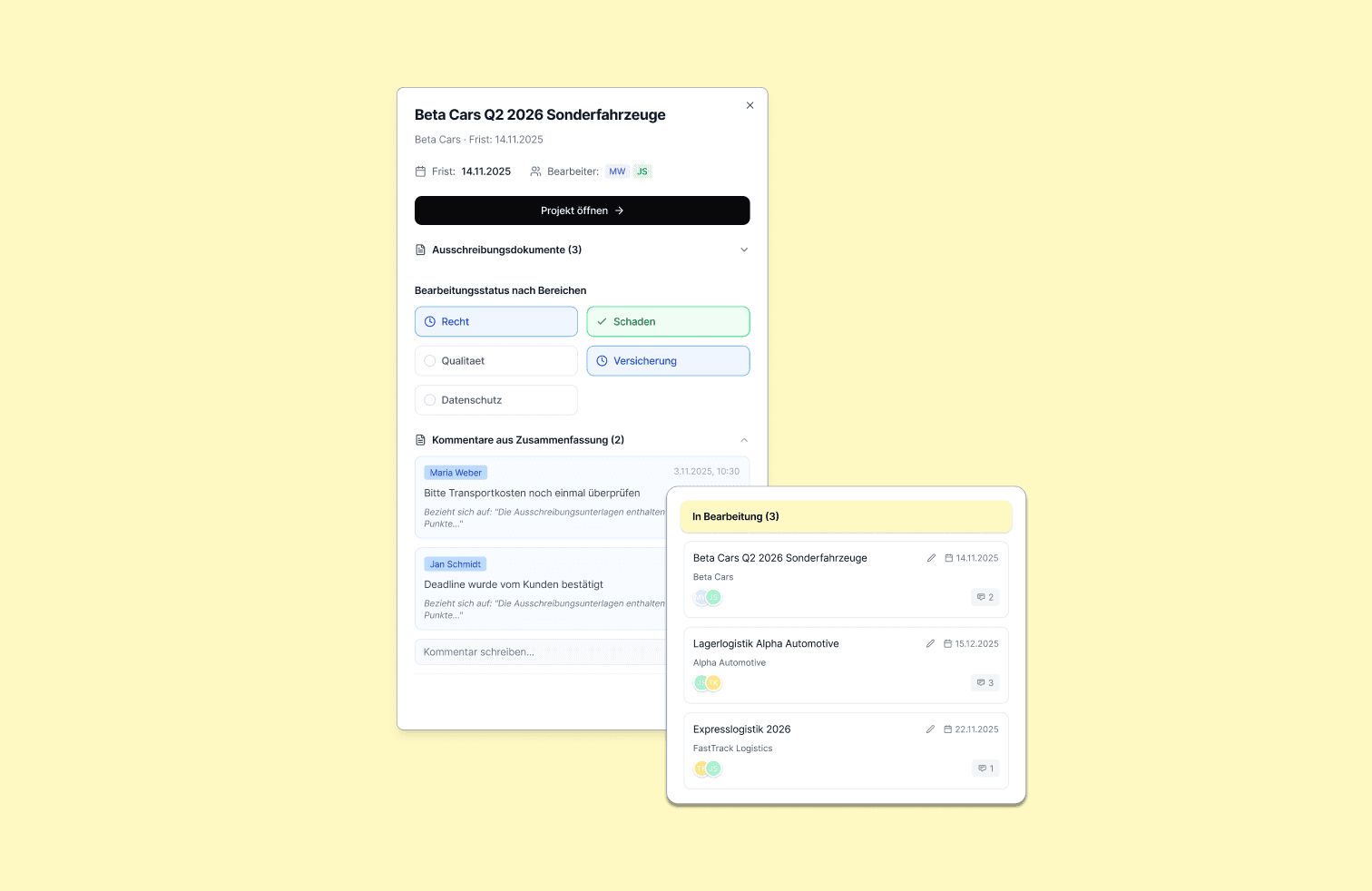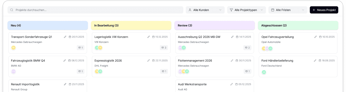 Behalten Sie immer den Überblick über alle Ausschreibungen. Lassen Sie Ihr Teammitglieder wissen, wie weit Sie mit dem Bearbeiten der Ausschreibung sind.